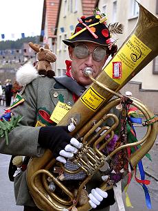von Wulf Wager Musik vermag Stimmungen und Gefühle zu entfachen und zu verstärken. Insofern ist Musik kaum rational zu erklären. Jeder empfindet sie anders. Rufen wir uns doch in Erinnerung, welch Empfindung man verspürt, wenn beispielsweise am Heiligen Abend das Lied "Stille Nacht, heilige Nacht", gesungen wird, oder wenn bei einer Beerdigung das Lied "Ich hatt’ einen Kameraden", geblasen wird. Ähnlich stark ist bei manchen Menschen die Empfindung, wenn nach fast einem Jahr zum ersten Mal wieder der Narrenmarsch erklingt. "Da läuft einem innerlich eine Träne hinunter", so hat mir gegenüber einmal ein befreundeter Narr diesen Gemütszustand beschrieben. "Mentale Authentizitätsbefindlichkeit" würde der Volkskundler dazu sagen. Für den einen mag das Klingen der Basler Piccolopfeifen nur ein schrilles, bis an die Schmerzgrenze heranreichendes Klirren und Sirren in hohen Frequenzen sein. Dem anderen vermittelt dieser Klang ein wohliges Gefühl, das mit einer Gänsehaut verbunden ist, und das ihm vermittelt: "Jetzt isch Fasnacht!". Musik in der Fasnacht ist so selbstverständlich, daß sich bisher nur wenige Forscher umfassend mit ihr beschäftigt haben. Von der Musik des NarrenWährend auf der einen Seite die Kirchenmusik mit ihren strengen harmonischen und formgebenden Regeln als höchste Kunstform und gleichsam als Zeichen der Gotteserkenntnis steht, gibt es auf der anderen Seite die profane Musik der Narren, die auf einfachsten Instrumenten gespielt wird. Bereits im Mittelalter findet man auf vielen bildlichen Darstellungen Narren mit immer denselben Instrumenten. Da ist zum einen die "Sackpfeife", der Dudelsack. Zum anderen sind es Trommel und Pfeife. Sebastian Brant stellt in seinem "Narrenschiff" 1494, im Kapitel "von ungedult der straff", einen Sackpfeife spielenden Narren dar, der Laute und Harfe, also hochentwickelte Kunstinstrumente zugunsten der einfachen groben Sackpfeife beiseite gelegt hat. Brant: Ein Sackpfiff ist des narren spil der harpfen achtet er nit vil Noch um 1860 herum muß die Sackpfeife oder der Dudelsack in Munderkingen bekannt gewesen sein, denn Carl Borromäus Weitzmann schreibt in seinem "Lied, beim Faschings-Begräbnis zu singen" Vollgesoffen, lahmgetanzt, Ruht des Faschings dicker Wanst Auf dem Leichenbette. Krüg und Gläser liegen leer Und zerstückelt um ihn her Dudelsack und Flöte... In den bildlichen Darstellungen des späten Mittelalters und der frühen Neuzeit, begegnet uns der musizierende Narr fast ausnahmslos als allegorische Figur. Neben Teufeln, Spielleuten und Lastertieren, war er der Gegenspieler des meist durch David verkörperten weisen Musikers. Die geordnete geistliche Musik ist als Zeichen der Gotteserkenntnis zu verstehen, während die einfache Musik des Narren für Dummheit und Ignoranz steht. Musik und Tanz galten seit dem Mittelalter als Verführung zu den Todsünden. Tanz, als Beginn wollüstigen Handelns verstanden, war in den Augen der klerikalen und weltlichen Obrigkeit Teufelswerk. Verdeutlicht wird dies durch ein Zitat des Kapuzinerpredigers Dionysius von Lutzenburg im Jahre 1688: "Der Satan hat keine Zeit lieber, als beim Tantzen. Sobald als durch seine Anstiftung ein Tantz anfange, wo wirfft er auch sein Netz auß die Seelen zu fangen, umb wann sie davon den Schwindel bekommen sie in sein Garn zu verwickeln. Das Netz oder Garn seynd die Spielleut, das Fressen, das Sauffen, das Hüpfen, das Springen, das unzüchtige Küssen und geyle Tasten." Auch Sebastian Brant führt in seinem "Narrenschiff" den Tanz als Teufelswerk auf: Von dantzen Ich hielt nah die für narren gantz Die freüd und lust hant in dem dantz Und louffen umb als werens toub Müd füß zu machen inn dem stoub Aber so ich gedenk dar by Wie dantz mit sünd entsprungen sy Und ich kan mercken und betracht Das es der tüfel hat uff bracht Do er das gulden kalb erdacht. Der dazugehörige Holzschnitt verdeutlicht auch, worauf es dem links abgebildeten Narren ankommt: Er zieht seiner Tänzerin den Rock hoch und faßt ihr ohne Umschweife in den Schritt. Der Tanz, sowohl als repräsentatives Schaubrauchtum, wie auch als paarbezogenes, individuelles Phänomen, ist ein wesentliches Element fasnächtlichen Treibens. Weil es beim Paartanz immer wieder zu unzüchtigen Handlungen kam, finden wir heute zahlreiche Hinweise auf Verbote des Tanzens während der Fasnacht in alten Gerichtsakten. In Konstanz wurde 1531 das Tanzen als Teufelswerk generell verboten, was aber z.B. drei Jahre später mehr als 100 Bürgerinnen und Bürger während der Fasnacht ignorierten und dafür bestraft wurden. In Rottweil heißt es 1738, daß den Gesellen der "Tanz samt Maskerade verboten" sei. Nur wenige Jahre später, nämlich 1743 wurde im prostestantischen (!) Schwenningen der halbe Flecken verhaftet. Fast alle Familien hatten beim Fasnetstanz gefeiert. Verbote und Verordnungen ziehen sich kontinuierlich durch die Fasnachtsgeschichte. Jeder Tanz bzw. jede Tanzveranstaltung und Tanzaufführung mußte genehmigt werden. 1805 erläßt das "Hochfürstlich Fürstenbergische Polizeyamt", in Donaueschingen eine "Redoute-Ordnung", bei der fast jede Regung der Gäste kleinlich reglemetiert wird. So auch das Tanzen: