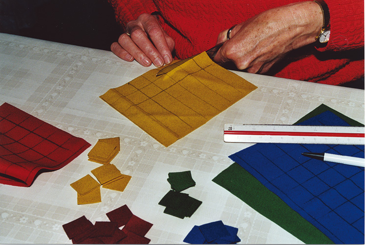 Um eines der eindrucksvollen Kiebinger Butzenhäser herzustellen, ist eine Menge Handarbeit nötig. Auf gutem Tuch werden zunächst ca. 1.600 der 3 x 3 Zentimeter großen Flecken aufgezeichnet und von Hand ausgeschnitten.